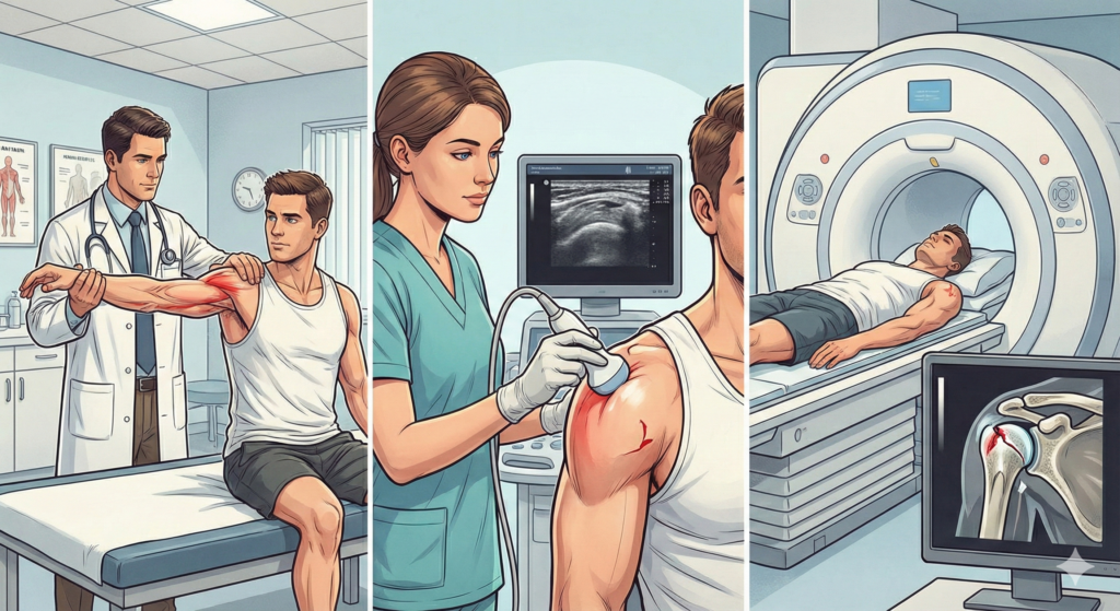 A detailed assessment of strength, range of motion, and tendon-specific tests.